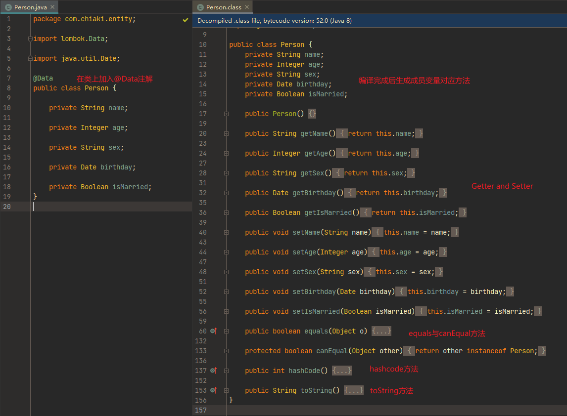 | @Data | 类 | 为类提供 Getter and Setter、equals、canEqual、hashCode、toString 方法 | @Date 效果 |