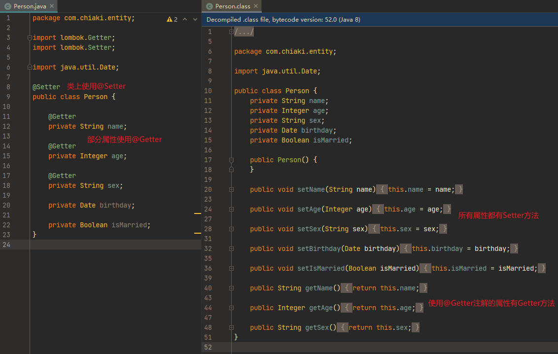 | @Setter | 类或者属性 | 为类的所有属性或单个属性提供 Setter 方法 | @Setter 效果 |