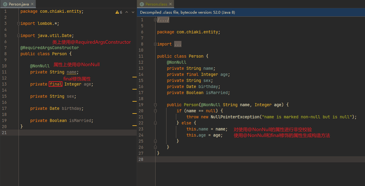 | @RequiredArgsConstructor | 类 | 使用 带@NonNull 或 final 修饰的属性来构造类的构造方法 | @RequiredArgsConstructor 效果 |