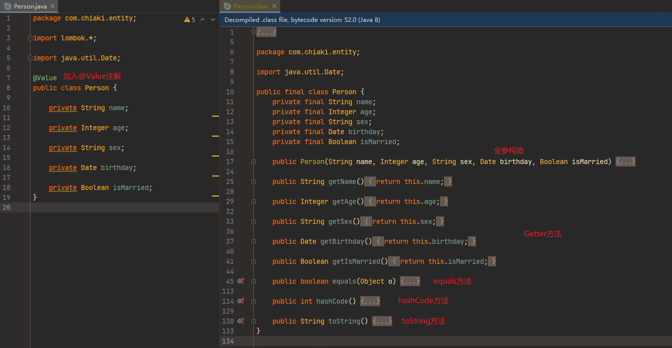 | @Value | 类 | 为类提供全参构造、equals、hashCode、toString 方法,为类的属性提供 Getter 方法 | @Value 效果 |